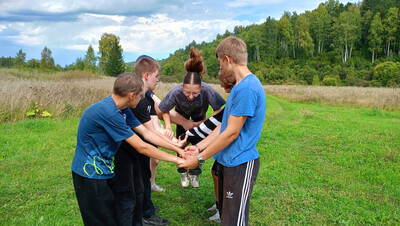 На берегу реки ребята разбили бивак, соревновались в скорости, силе и ловкости: передавали ракетку на скорость, тянули импровизированный канат, участвовали в эстафете «Бегающие тележки».