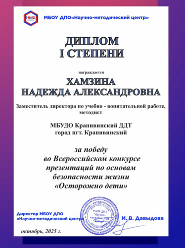 Интерактивная презентация была представлена на Конкурс презентаций по основам безопасности жизнедеятельности «Осторожно: дети!», организатором которого выступил МБОУ ДПО «Научно – методический центр» г. Кемерово.