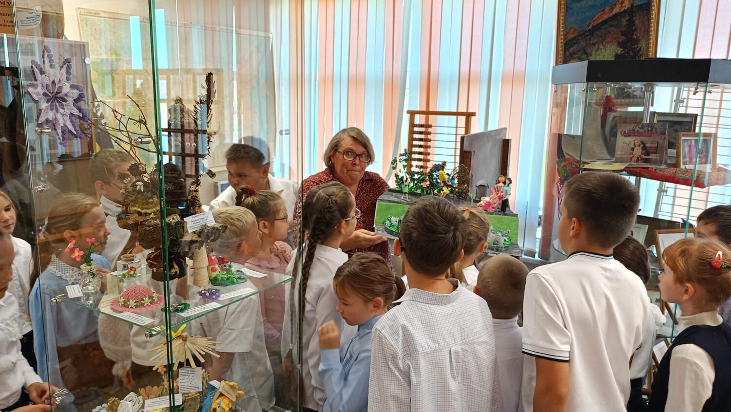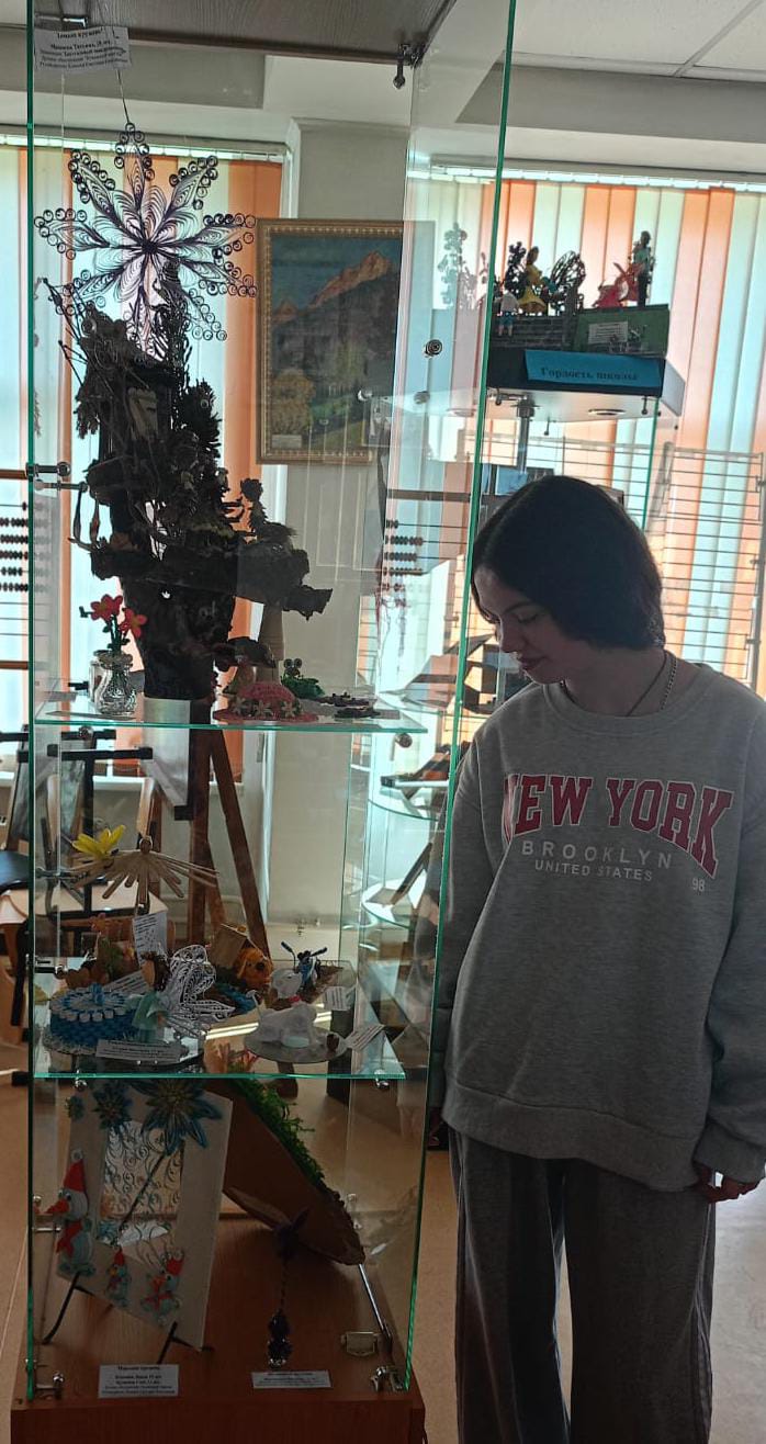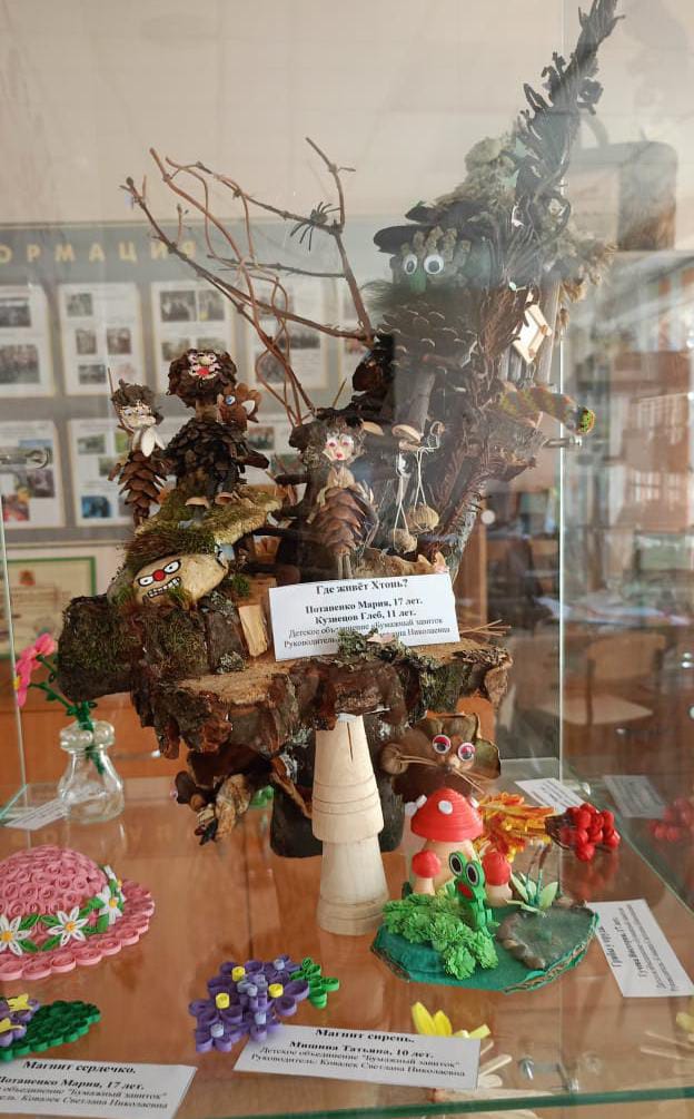 Дети с большим интересом и увлечением рассматривали представленные работы, задавали вопросы и делились впечатлениями. Особое удивление и восторг у большинства ребят вызвала работа «Где живёт Хтонь», выполненная из природных материалов.